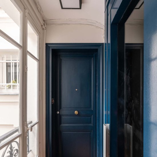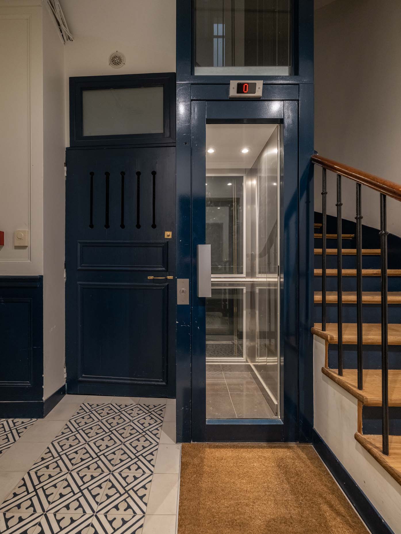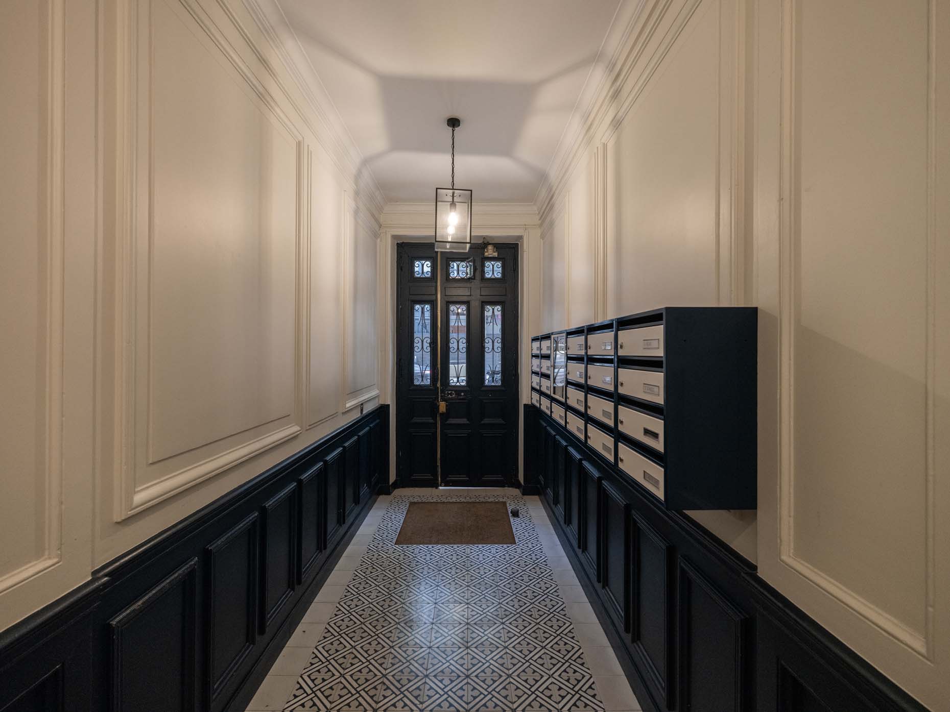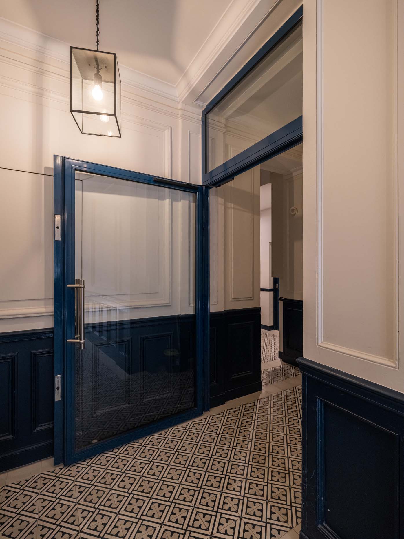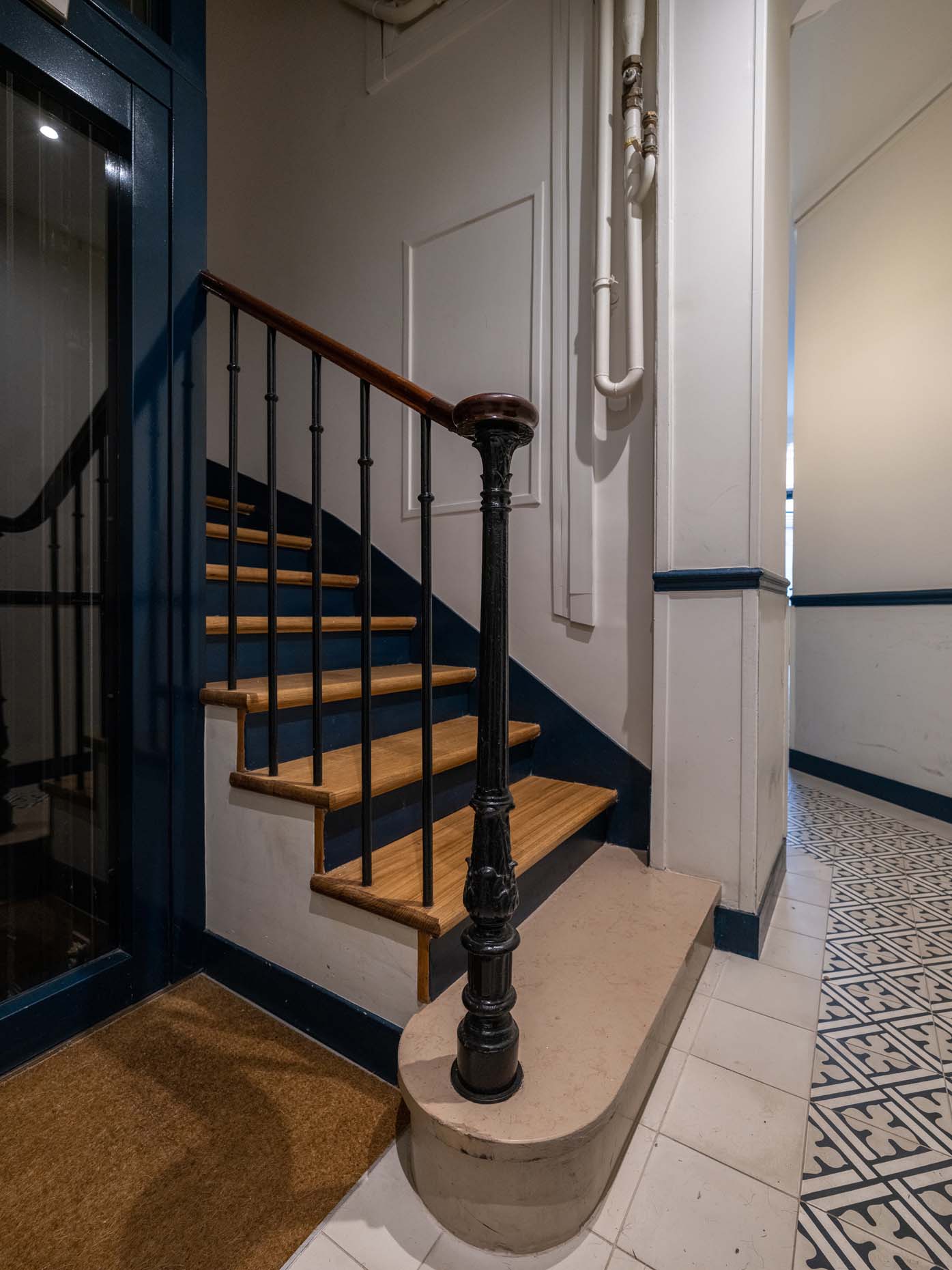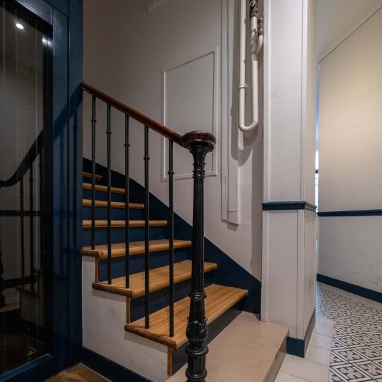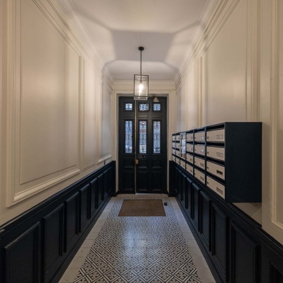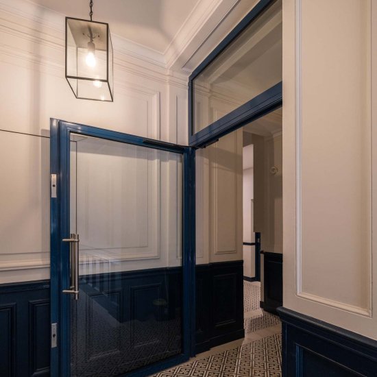Le hall de l’immeuble ainsi que la cage d’escalier du bâtiment rue de cet immeuble du 5e arrondissement ont été rénovés en totalité. La création d’une porte sas, le remplacement des carreaux ciments et l’apport de couleurs sobres permettent de redynamiser l’immeuble.